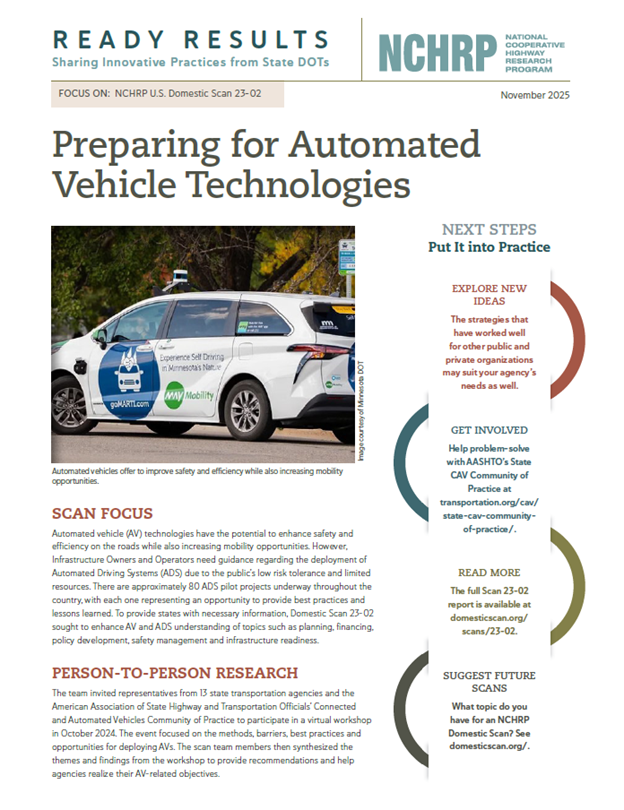 Original Scope: Current technology advances and deployments of automated vehicle technologies using Automated Driving Systems (ADS) have the promise of significant system safety and operational improvements as well as equity and mobility opportunities to address current, unmet needs. However, these rapidly available solutions and applications also pose challenges for Infrastructure Owners and Operators (IOOs) who seek guidance as the learning curve is steep, risk tolerance is low, and they must deal with constrained resources. Many transportation organizations are currently exploring the testing and deployment of automated and connected technologies and, specifically, Automated Driving Systems (ADS).