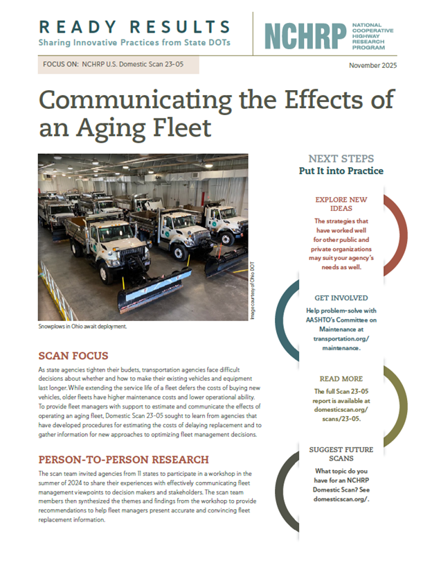 The objective of this scan is to examine organizations that have successfully developed and implemented practices and procedures to estimate the cost of delayed replacement of DOT fleet assets beyond the optimal replacement period. The scan team will gather data that might be used to develop decision making tools and models that can effectively communicate to decision makers the long-term effects of aging fleet assets.